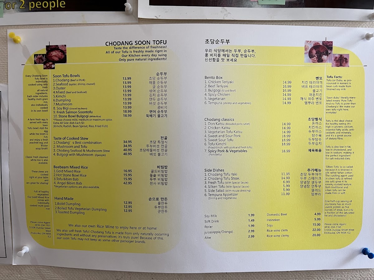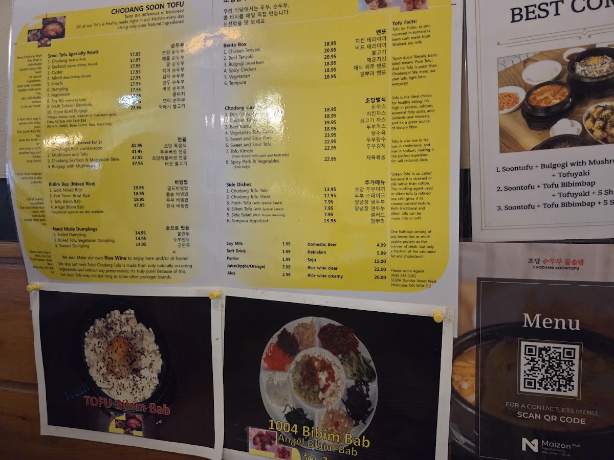 **About Chodang Soon Tofu**Chodang Soon Tofu, nestled in Etobicoke, Canada, is a hidden gem specializing in freshly made, authentic Korean tofu dishes. The restaurant stands out for its comforting ambiance and exceptional service, providing diners with a homey experience. Its signature soon tofu curry, seafood, and bulgogi dishes are crafted from the finest, locally sourced ingredients, ensuring a burst of flavor in every bite. Patrons rave about the generous portions and hearty meals, including the delectable homemade tofuyaki and stone pot rice. With a commitment to freshness and health, Chodang Soon Tofu is a must-visit for Korean food lovers seeking quality and authenticity.