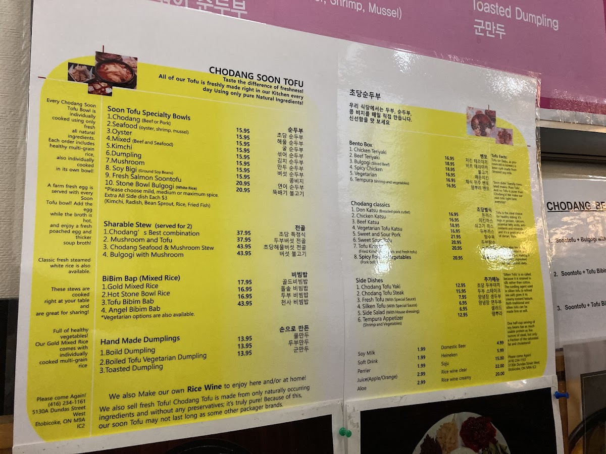 “ This a legit old school Korean spot with in-house made tofu which is featured heavily throughout the menu. First off, the tofu is absolutely top-class. Very fresh, subtle flavour, and delicious texture (medium to firm). If tofu is your thing, you should definitely give this place a try. They have a number of dishes that play off their tofu, but my favourite is the veggie dumplings. The dumplings are classic Korean style and steamed. I think I remember chives within the dumplings but because the tofu is so fresh it really brings out the adjacent flavours of the other ingredients within the dish. The Yaki-tofu is a Japanese style fried-tofu block with a sweet soy sauce marinade. This was ok for me. It wasn't super crispy and so I felt the textures didn't express the tofu flavour in the best way. The soon tofu dish is banging. At other soon tofu restaurants, there's a number of other ingredients within the dish (kimchi, bok choy, mushroom, etc..) I got the original pork and that's exactly what they delivered: ground pork, a clay pot full of homemade silken tofu and the deliciously spicy soup. I thought it would be boring with other veggies in the soup, didn't even miss it the tofu is so good. Classic side dishes are free (bean sprouts, kimchi, and also a nice taster of fresh firm tofu) with a very nice addition of two fried fish. That's different than most Korean places these days and very nostalgic as that's very old school Korean restaurant style. Finally, the best part of the tofu is that it tastes INFINITELY better the next day. We brought the dumplings and yaki-tofu home and left it in the fridge, I am not exaggerating, it tastes better the next day. I guess that in-house tofu recipe need a day to really let the flavours mellow into the dish. Big fan of this place, will be taking my wife there again. ”